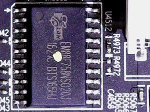 A BIOS chip is located right under the small switch we saw earlier. It contains the default overclocked firmware and a more conservative reference fall-back.