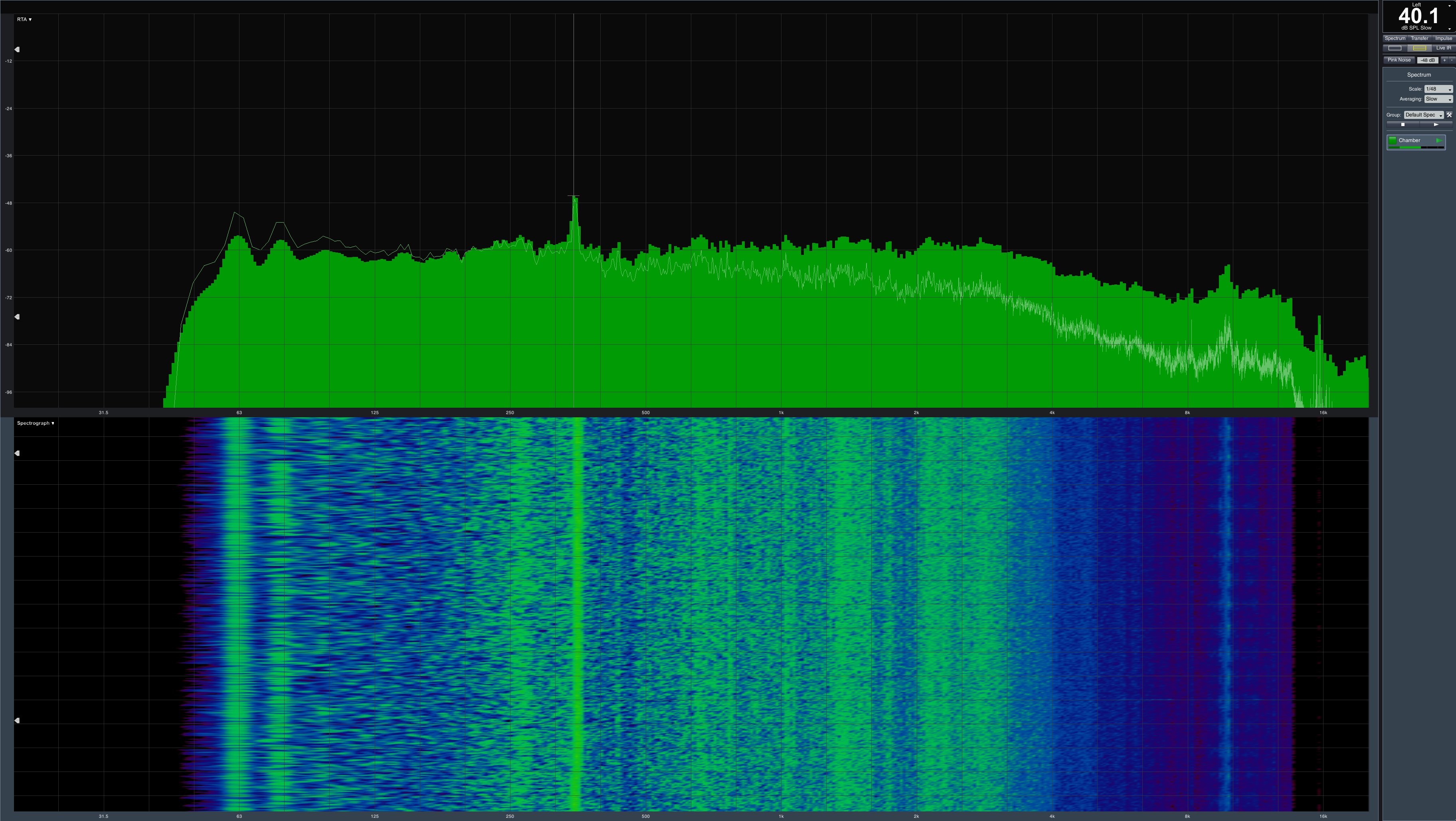 To generate these images, we recreate the same conditions from our closed-case testing on an open test bench in a test chamber. Although the results don’t look bad, we’re able to identify several points along the spectrum with activity. First, we can see and hear the fans’ motor and bearing noises. Then, there’s high-pitched coil whine up at the top of the spectrum.