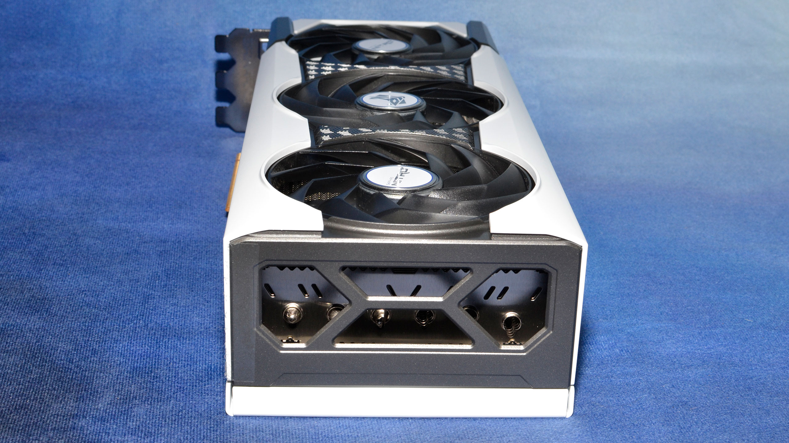 Like most other modern graphics cards, the Sapphire RX 6950 XT includes three DisplayPort 1.4 and one HDMI 2.1 outputs. As noted already, the IO bracket is three slots wide, with two of those slots dedicated to letting air flow out of your PC case. However, the perpendicular orientation of the heatsink fins means almost no air will actually do so.