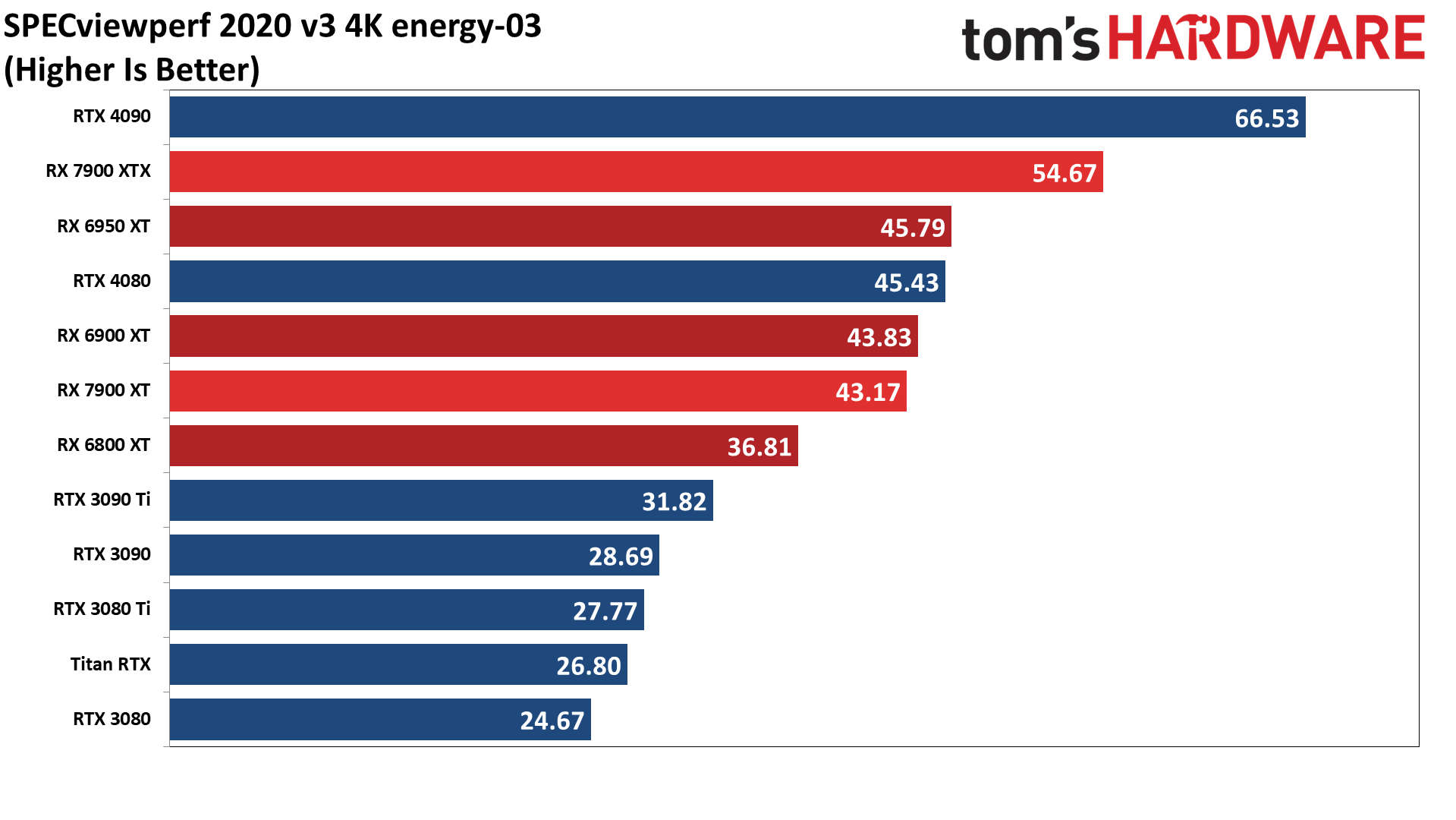 AMD released updated OpenGL drivers earlier this year that greatly improved performance in certain professional applications, and that shows up in SPECviewperf. Using our aggregate score, even the lowly RX 6800 XT comes out ahead of Nvidia's fastest GPU. A few tests, like catia-06, creo-03, medical-03, and especially snx-04 generally favor AMD's GPUs. In fact, only 3dsmax-07 and solidworks-07 really favor Nvidia's GeForce RTX line right now, with energy-03 and maya-06 also giving the RTX 4090 the win.