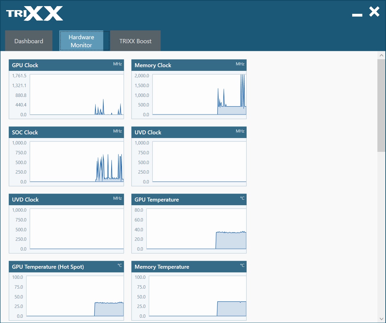 Sapphire’s TriXX software supports the new RX 5600 XT Pulse OC, and sports a recently re-designed GUI along with other updates. The software’s main screen, called Dashboard, includes GPU and Memory clock rates along with GPU temperature and GPU load indicators. Current GPU voltage is displayed as well. Other information on the screen includes details about the card, from the GPU specs along with the currently installed driver.