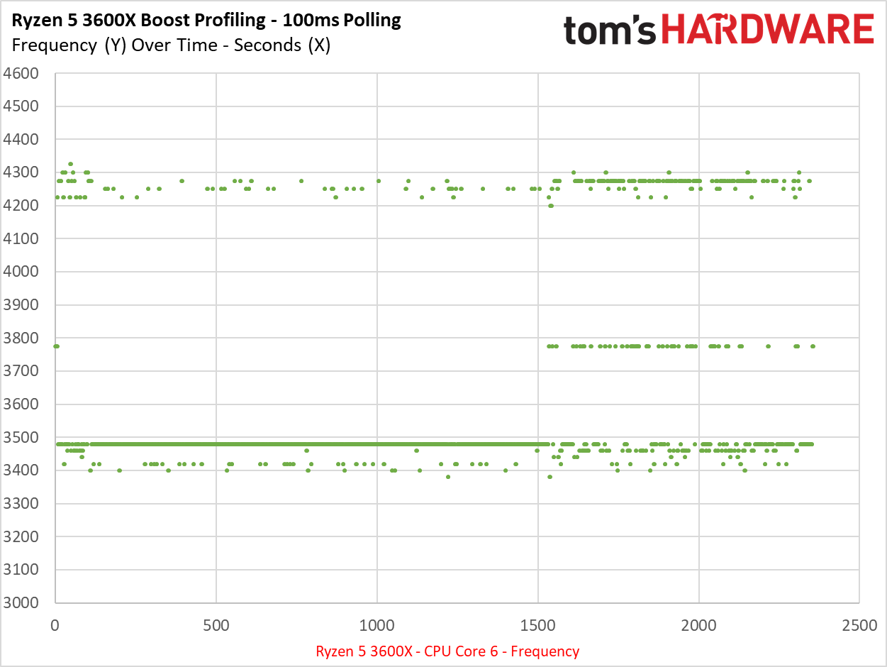 It's important to note that modern CPUs operate on the order of billions of cycles per second (though changing power states takes 1-2ms for Ryzen 3000 processors), so capturing an accurate picture of boost activity requires monitoring the processor with granular polling settings. Most CPU utilities poll the processor for its 'vital' statistics every second, thus missing fast state transitions, but many utilities allow you to adjust the granularity.