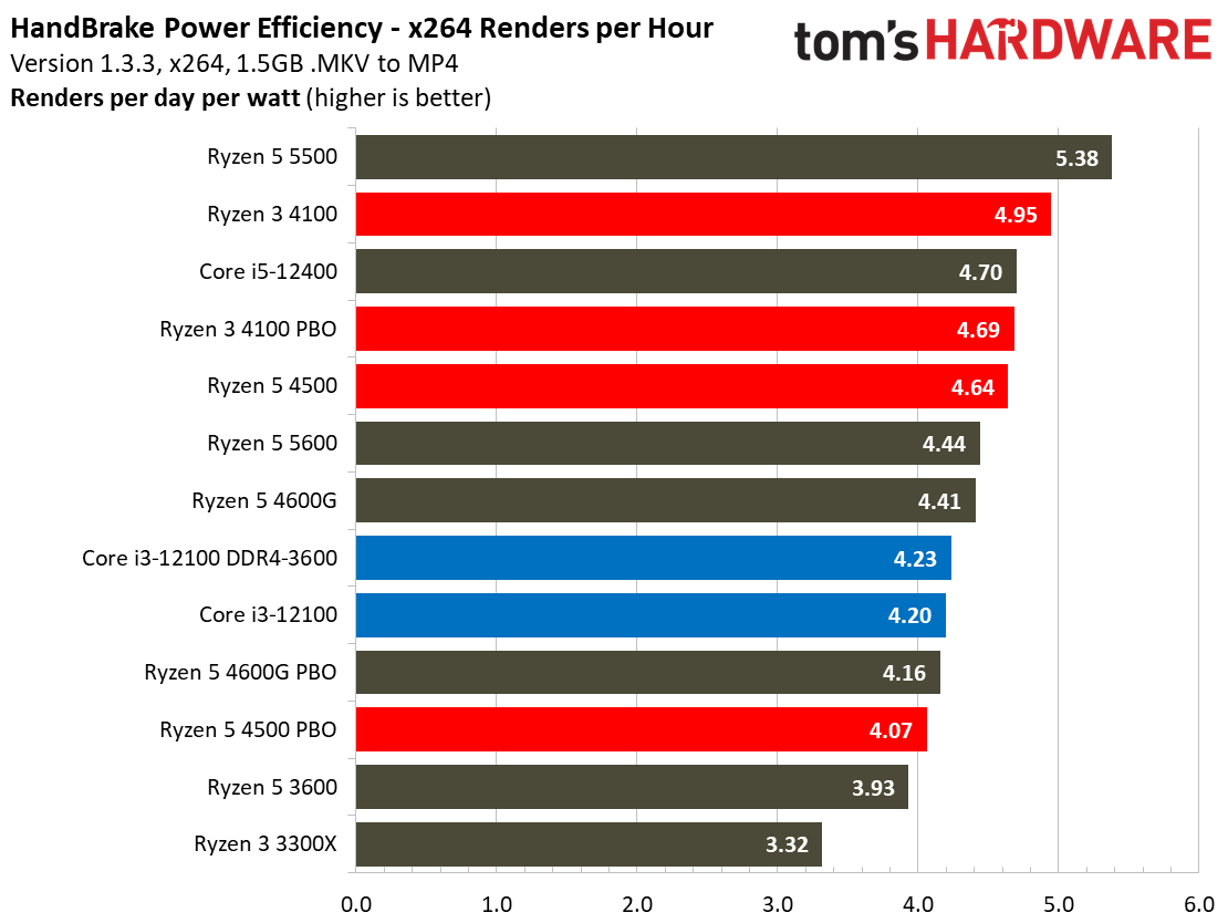 Meanwhile, the six-core Ryzen 5 4500 unsurprisingly pulls more peak power than the quad-core Ryzen 3 4100, but its faster performance results in better efficiency profile than the Core i3-12100 in some scenarios.