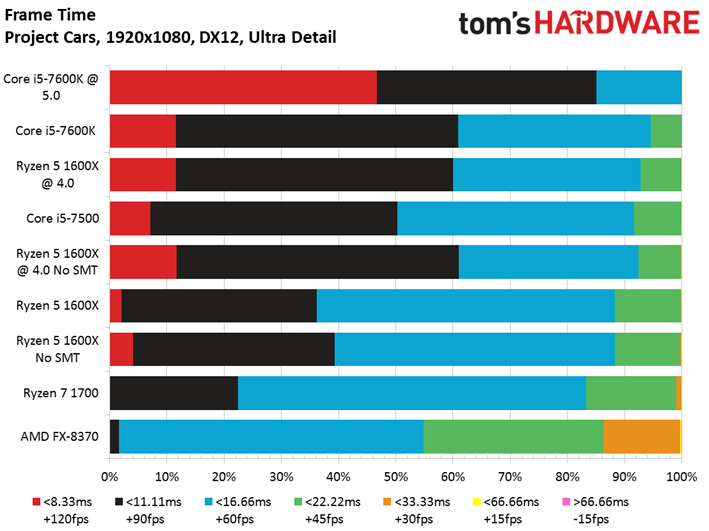 Project CARS clearly responds most readily to high clock rates and IPC throughput, as evidenced by the difference between Intel's Core i5-7600K at stock and overclocked settings. Incidentally, those two configurations land in first and second place.
