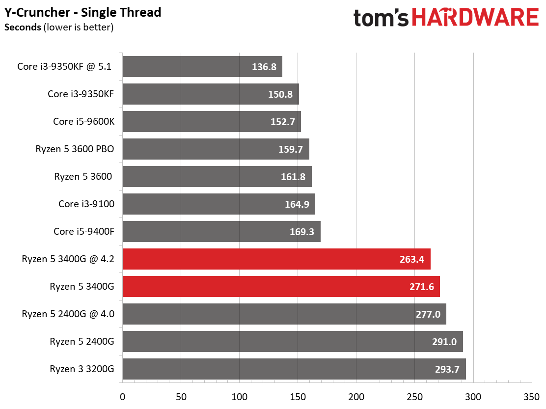 The heavily-threaded y-cruncher benchmark, which computes pi using the taxing AVX instruction set, finds the 3400G trailing by a significant margin in both the single- and multi-threaded tests. You'll need to step up to a third-gen Ryzen processor to beat Intel's performance in AVX-heavy workloads.