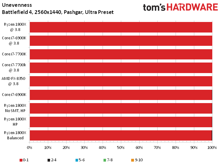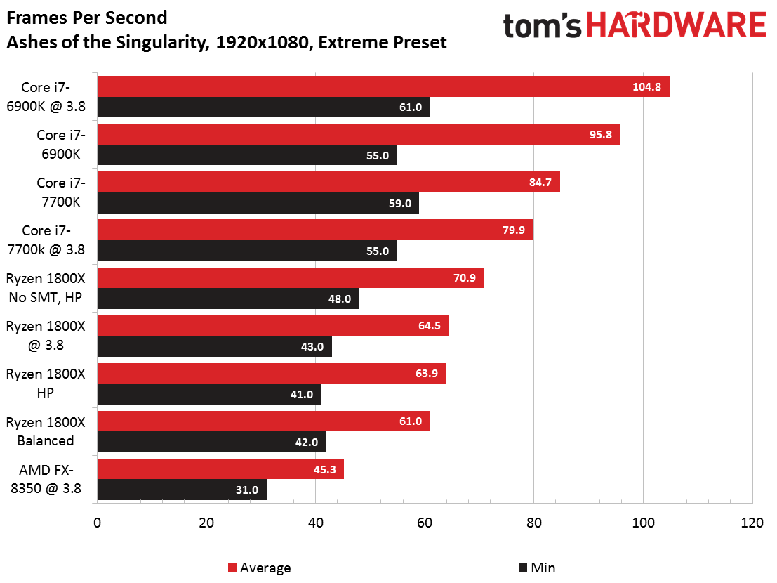 As mentioned, we encountered lower-than-expected results in many of our game benchmarks. Concerned that the explanation could be related to Windows' handling of P-states, we ran tests on Ryzen under the High Performance and Balanced power profiles as a diagnostic measure. The former is denoted with an HP in our charts. Intel's chips are tested using Windows' Balanced profile, representing the way most of us configure our desktops.