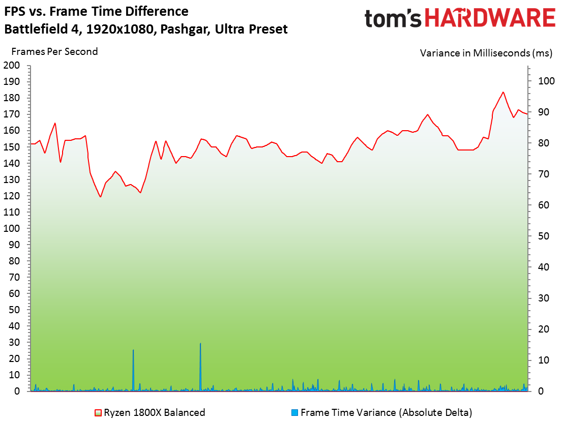 We traipse into graphics-bound territory during our 1920x1080-based Battlefield 4 testing. Ryzen 7 1800X in its stock configuration (with the Balanced power profile) is the only modern processor that doesn't average 160 FPS or more. It fares better with the High Performance profile activated, pulling in with the rest of the field if you're willing to leave Windows in this mode.