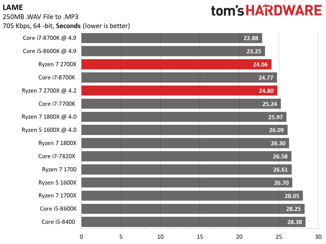 LAME is the quintessential example of a single-threaded workload, and the 2700X posts solid gains over Ryzen 7 1800X in its stock configuration.