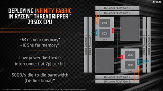 Remember, each Zeppelin die has its own memory and PCIe controller. If a thread running on one core needs to access data resident in cache on another die, it has to traverse the fabric between those dies and incur significant latency. Naturally, the latency penalty between dies is higher than it is between CCXes in a single-die configuration. But AMD claims to have made some improvements there. The 2950X purportedly offers 64ns latency to near memory and 105ns to far memory, while the previous-gen 1950X had to wait 78ns and 133ns, respectively. As per usual, the speed of the Infinity Fabric is tied to the memory controller, so higher data rate settings are desirable. AMD measured Threadripper 2's fabric performance with a 3200 MT/s data rate, which means fabric latency at the recommended DDR4-2933 will be higher.
