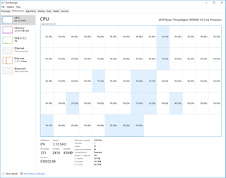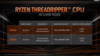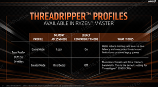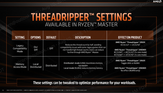 AMD also allows you to disable cores in Legacy Compatibility mode, which disables one die via a Windows command. This allows some programs that won't function with 32 threads to execute properly, and it also eliminates cross-die communication. The system can still access I/O connected to the second die, though, so you don't lose any associated memory or attached peripherals.
