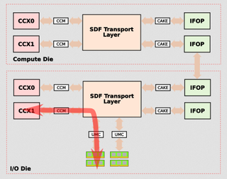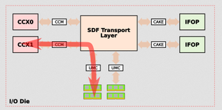 According to chip analyst David Schor at WikiChip, each request from the compute die requires interfacing with the Cache-Coherent Masters (CCM), which then interfaces with the CAKE (Coherent AMD socKet Extender) module that encodes the request and sends it to the remote I/O die. The remote CAKE module then decodes the request, fetches the requested data via the UMC (Unified Memory Controller), and then encodes the data and transmits it back to the compute die.