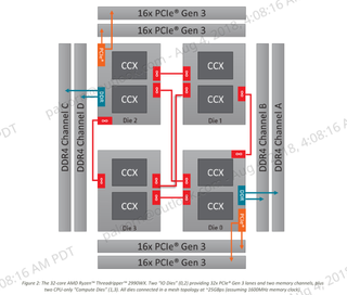 Threadripper 2990WX borrows from AMD's EPYC server designs and comes with four active dies. The company fused off PCIe and memory control from two of the dies, creating silicon only useful for computing. Meanwhile, the other two I/O-enabled dies serve up two channels of DDR4 memory support and 32 lanes of PCIe 3.0 each.