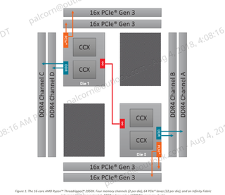 Increased traffic and reduced fabric throughput will have a tangible impact on memory-hungry applications, leading to sub-par performance scaling under some conditions. Although Threadripper 2990WX is clearly aimed at the semi-professional market, configurations hosting multiple GPUs may slow down due to increased fabric latency and reduced throughput to remote PCIe lanes. That'd also affect the performance of PCIe-based M.2 storage and LAN devices connected to remote dies.