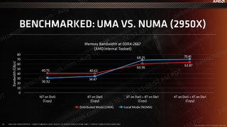 UMA (Distributed) is pretty simple; it allows both dies to access all of the attached memory. NUMA mode (Local) attempts to keep all data for the process executing on the die confined to its directly attached memory controller, establishing one NUMA node per die. The goal is to minimize requests to remote memory attached to the other die. NUMA works best if programs are designed specifically to utilize it. Even though most desktop PC software wasn't written with NUMA in mind, performance gains are still possible in non-NUMA applications.