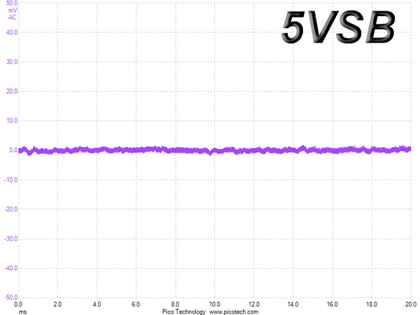 The following oscilloscope screenshots illustrate the AC ripple and noise registered on the main rails (+12V, 5V, 3.3V and 5VSB). The bigger the fluctuations on the screen, the bigger the ripple/noise. We set 0.01V/Div (each vertical division/box equals 0.01V) as the standard for all measurements.