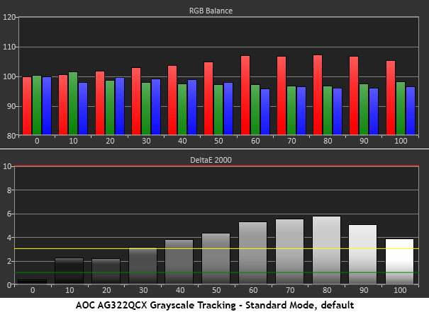 None of the monitors in this group have any visibly significant color accuracy problems. Though the AG322QCX comes in fifth place here, the margin from first to last is quite small. We started out at 2.64dE DCI color error, so our calibration didn’t do much for this test result. Our adjustments had a greater impact on grayscale accuracy.