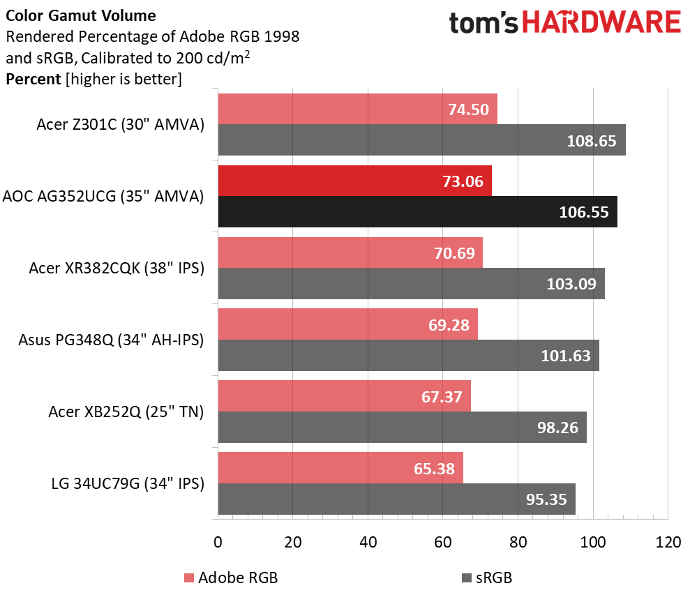 Thanks to that bonus volume from all three primaries, the AG352UCG exceeds the sRGB gamut spec by 6.55%. This is fine for gaming and any other application except proofing. For that purpose, we recommend a custom profile be created in your color management software of choice. This monitor is suitable for photo and graphics editing.