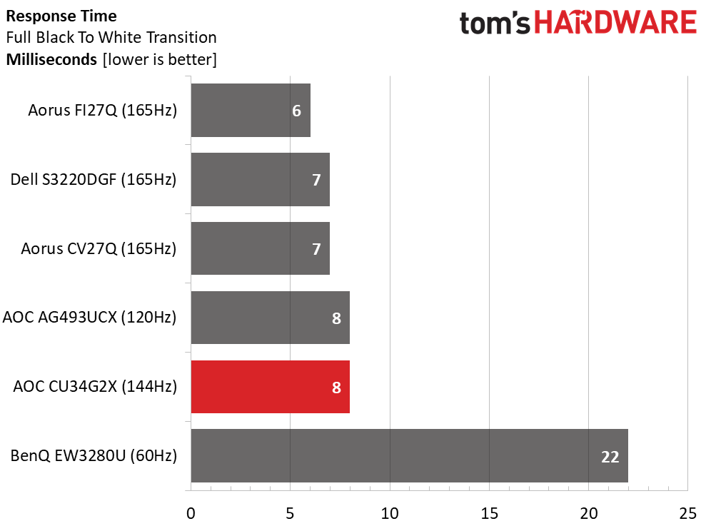 In the response time test, the CU34G2X was just 1ms off from the 165 Hz screens. We thought it would beat the 120 Hz AG493UCX, but it didn’t quite pull that off. It did lop 2ms off the total lag score, fitting in right between the 120Hz and 165Hz levels, as it should. While the most competitive gamers will want even less lag, the majority of players will enjoy the smoothness and responsiveness of the CU34G2X. We certainly observed no issues during gameplay with perfect synchronization of our gaming mouse and gaming keyboard inputs to on-screen action.