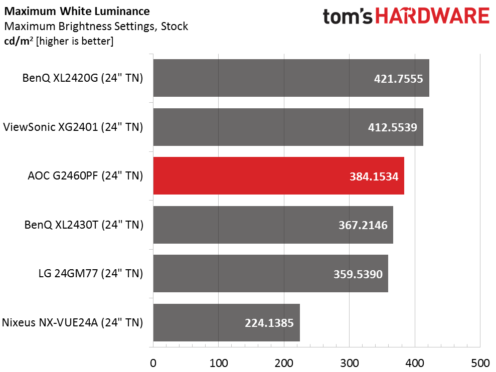 The Nixeus is the only screen that doesn’t put out a ton of light. The rest easily exceed 300cd/m2, and the AOC easily beats its claimed brightness spec. The G2460PF’s black levels are only fair but the resulting contrast comes close to our 1000:1 preference. Remember that it’s the least-expensive product here today. This is more than acceptable performance.