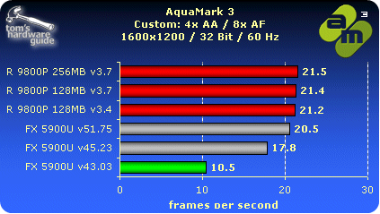 We colored the scores with the NVIDIA drivers v45.23 and v51.75 because they do not render the correct image (see quality comparison). The only driver rendering a correct image is v44.03 from Mai 2003, which shows a very low performance compared with the ATI cards.