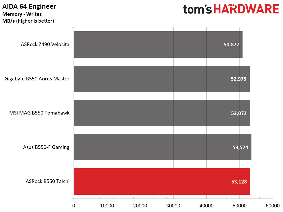 In our synthetic benchmarks, the B550 Taichi kept up with the other boards tested and the results fell within the expected range. There’s nothing out of the ordinary here.