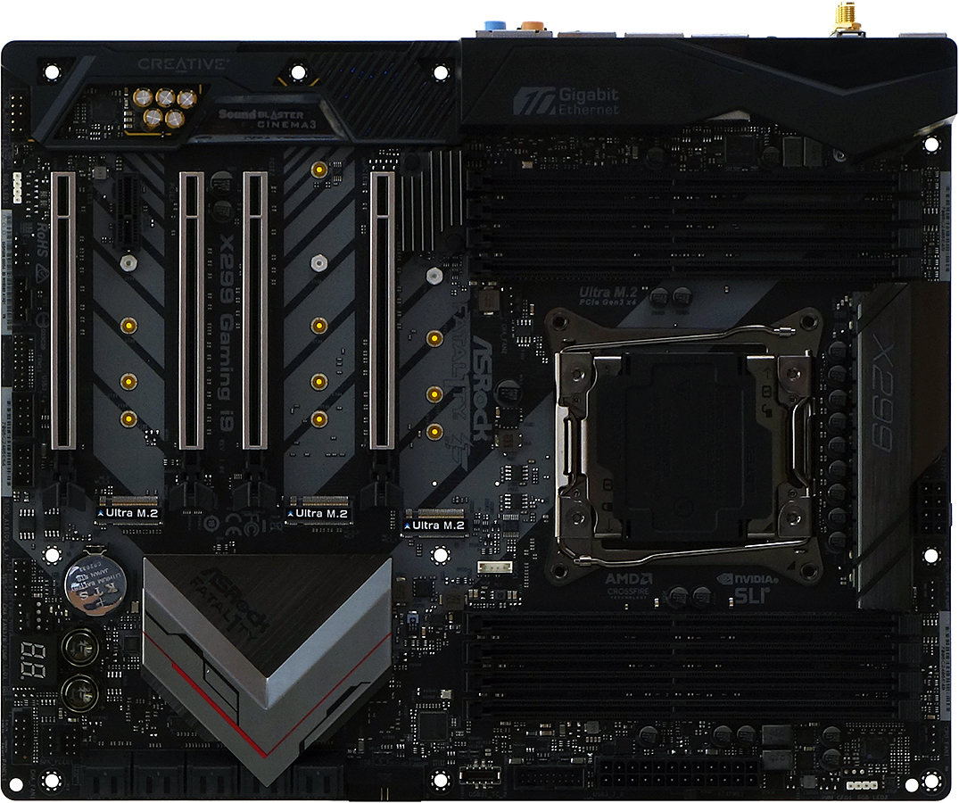 After noticing a few empty solder pads on ASRock’s value-awarded X299 Taichi, we said that we couldn’t wait to see the more advanced motherboard that will be based upon the same circuit board. We didn’t need to wait long. The high-end version was already in queue by the time the first review published. The Fatal1ty X299 Professional Gaming i9 adds an AQtion AQC107 10GbE controller from Aquantia, a front-panel USB 3.1 10 Gb/s header, a second ASM3142 USB 3.1 controller to support the added front-panel header, onboard power and reset buttons, and Creative’s Sound Blaster Cinema 3 audio software. It also loses the cheaper board’s DTS Connect license, since compatible receivers are generally thought of as being home-theater equipment. This is, after all, a “Professional Gaming” motherboard.