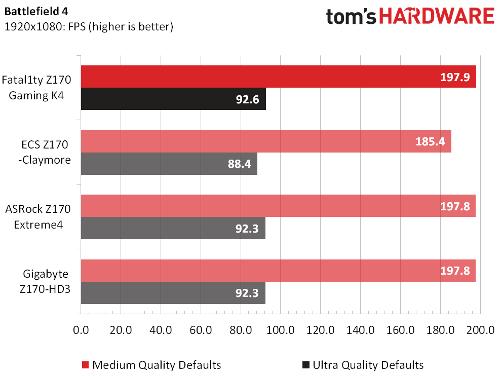 The Fatal1ty Z170 Gaming K4 leads slightly at the low settings of Grid 2 and Far Cry 3, but not by enough to be visible on the screen. A look back at test notes also showed that the minimum scores were on par with other machines, so we'll just keep this tiny difference in mind for further performance discussions.