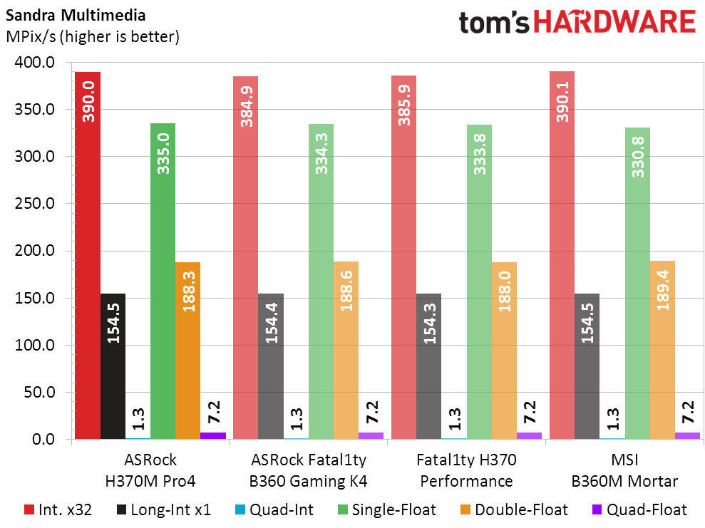 Miniscule leads continue through three of PCMark8’s tests, but the gain over other ASRock boards that also shows up in Sandra Dhrystone merely puts it on par with the B360M Mortar…a board that landed last in PCMark’s Creative test.