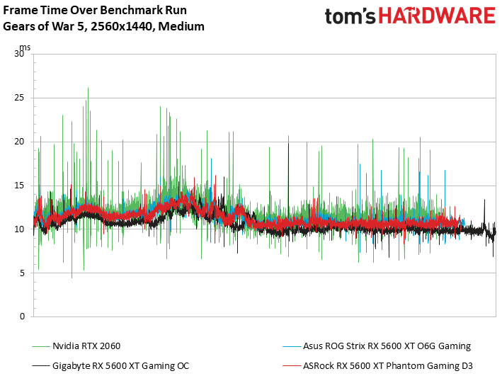 As we raise the resolution to 2560 x 1440 and lower image quality to medium, the ASRock card averaged 97 fps across all games—a mere 1 fps less than the 1080p ultra results. At this resolution, all 10 titles were above 60 fps, including Metro Exodus at 68.7. The rest of the games are in the upper 80s or well over 100 fps. At these frame rates, some games can use high or ultra settings, but Metro Exodus and Shadow of the Tomb Raider will need some tuning to maintain a smooth gaming experience. At medium settings, the ASRock DS3 card and all other RX 5600 XTs easily handle 1440p gaming.