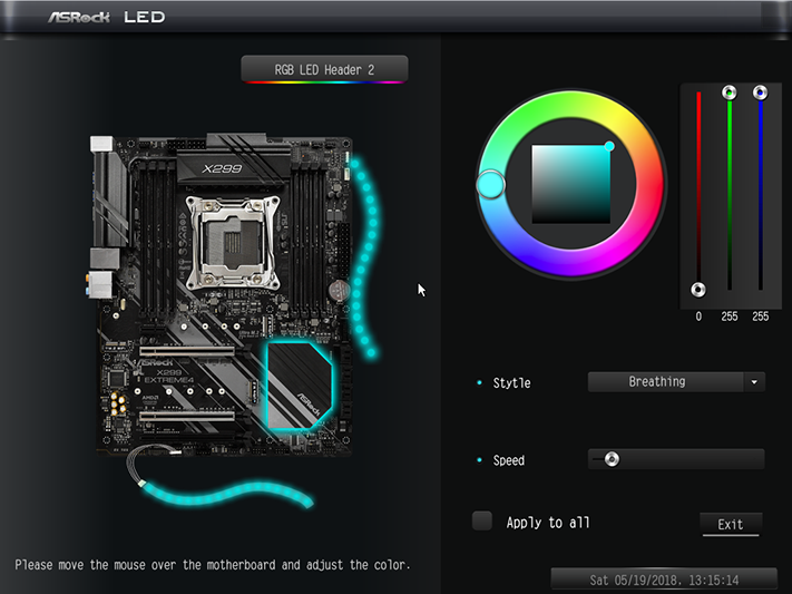 For example, we’re sure we wouldn’t have been able to see an illustration of the X299M Extreme4 on an older version of the software. The image shows the one onboard lighting zone, which sits under the PCH heat sink, in addition to the two RGB LED strip headers.