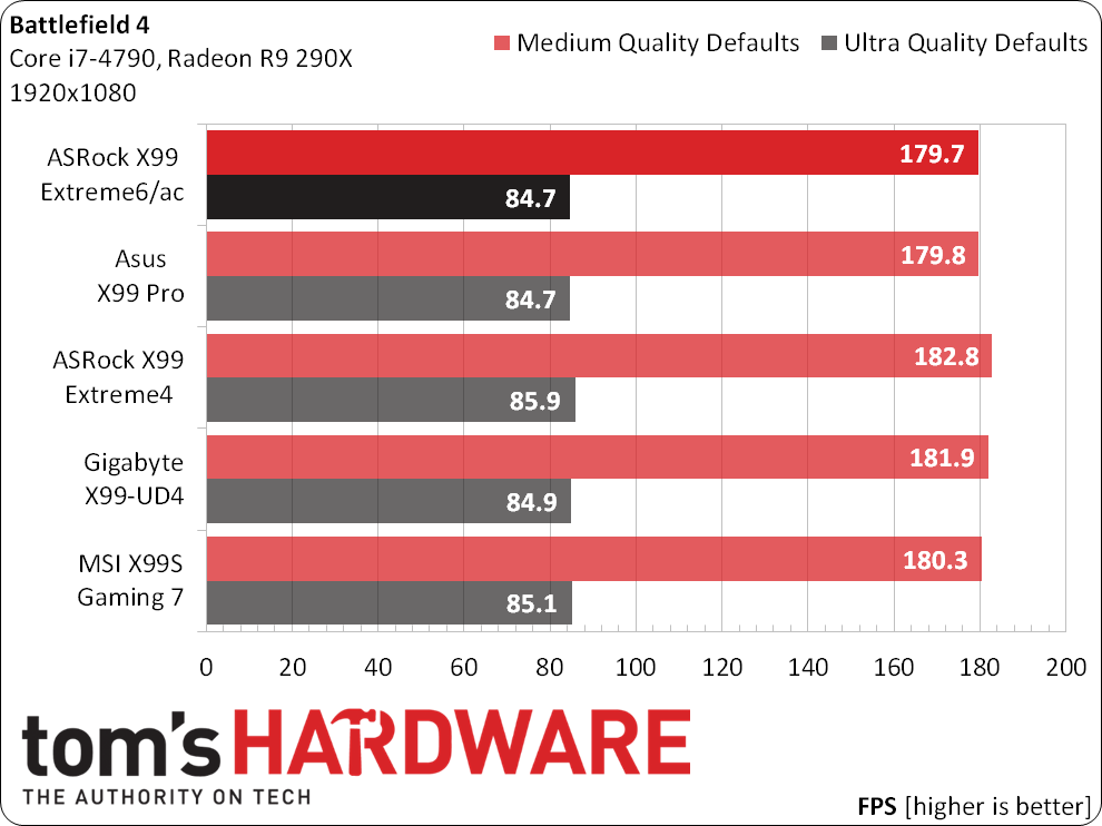 A quick comparison of ASRock’s X99 Extreme6/ac and X99 Extreme4 shows the benefit of a little firmware tuning. Our first batch of boards simply wouldn’t run this processor stably at the 125MHz BCLK needed to reach DDR4-3000 at Intel-validated multipliers. Asus’s X99 Pro is the reason for that long-winded description, since it’s the only board we’ve tested so far to support memory ratios exceeding Intel’s validated 10x maximum.