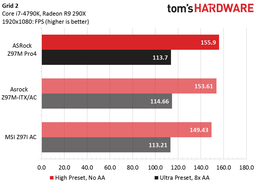 Deviation is minimal, especially considering the limitations of the ITX boards, which is just what we like to see. I did see some fluctuation while benching Grid 2 with some initially low framerates. A few reboots solved the problem and I wasn't able to replicate it. This shows how sensitive Grid 2 is to RAM rather than any fault of the Pro4.