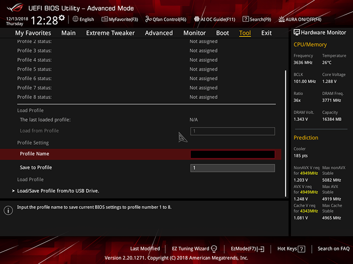 The Asus Tool menu includes a shortcut to its firmware flashing GUI, secure erase for SSDs, a submenu to store and retrieve firmware settings as one of eight user profiles with the additional ability to import and export these from a USB flash drive, a hotkey assignment menu for an optional ROG OC Panel, an SPD reader for memory programming, a menu to disable Asus Armoury Crate automatic downloads, and a graphics card information screen.