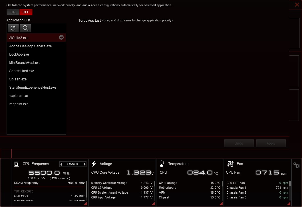 Asus’ software suite is still the same but updated to support the AMD processors. There are several applications for various functions, ranging from RGB lighting control, audio, system monitoring, overclocking, etc. We’ve captured several screenshots of the applications below. Here’s a look at Ai Suite 3, Armoury Crate, Sonic Studio and the Realtek Audio application.