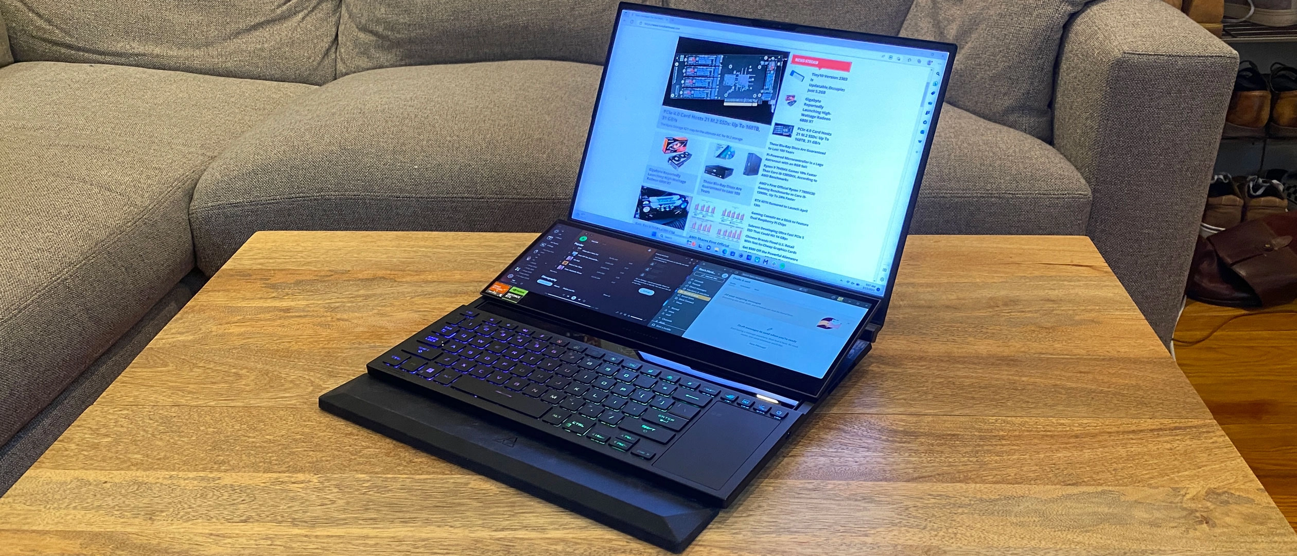 Is the screen useful? Yes, it is. I'm an advocate of more screen real estate. In my day-to-day work, it's a useful place to stash chat apps like Slack and music players such as Spotify . I could do the same with Discord on the bottom and a game on top. Asus has made the suggestion of putting tracks for video or music editing on the bottom while doing other editing on top. I had to adjust window and font sizes to see some things clearly on the small screen, but it works.