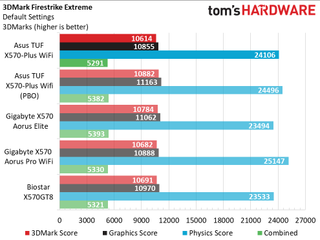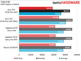 In our synthetic set of tests, the Asus TUF Gaming X570-Plus Wi-Fi performed well, mixing it up with the other X570 motherboards. All results were within general run variance difference with no anomalous data points. In general, PBO showed some improvement across most tests, but not much overall.