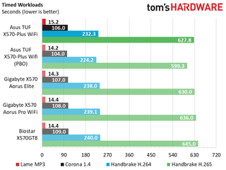 Our timed The timed applications also show little difference between the boards. Enabling PBO showed notable improvements here performing on average a bit over 4% better than stock in these tests.
