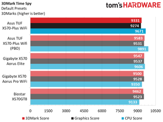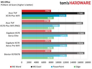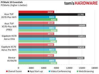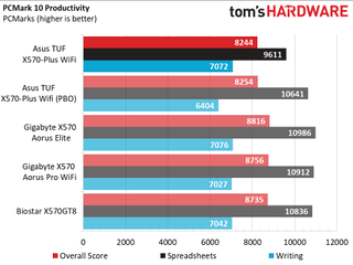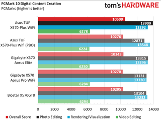 Overall performance differences between the boards we tested were negligible, outside of the PBO results which showed gains in timed applications, but otherwise nothing notable. The X570-Plus Wi-Fi’s worst showing was in productivity where it showed 6% less performance in those tests. Creativity testing showed it was 2% faster there, so it's a give and take it seems (that and PCMark’s consistency isn’t the greatest).