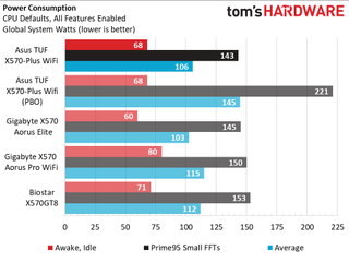 On the power consumption front, the Asus TUF Gaming X570-Plus Wi-Fi idled at 68W, with load power reaching 143W. With PBO enabled, we saw 221W in our Prime 95 testing, nearly 80W more than stock. If you are the type of user interested in saving some power, leave PBO disabled as the performance gains are simply not worth the notable power increase.
