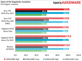 Game results continue to show a very tight set of results without any appreciable differences. PBO didn’t do much for gaming, but did show an almost 5% gain in Ashes at 1080p using the ‘crazy’ settings.
