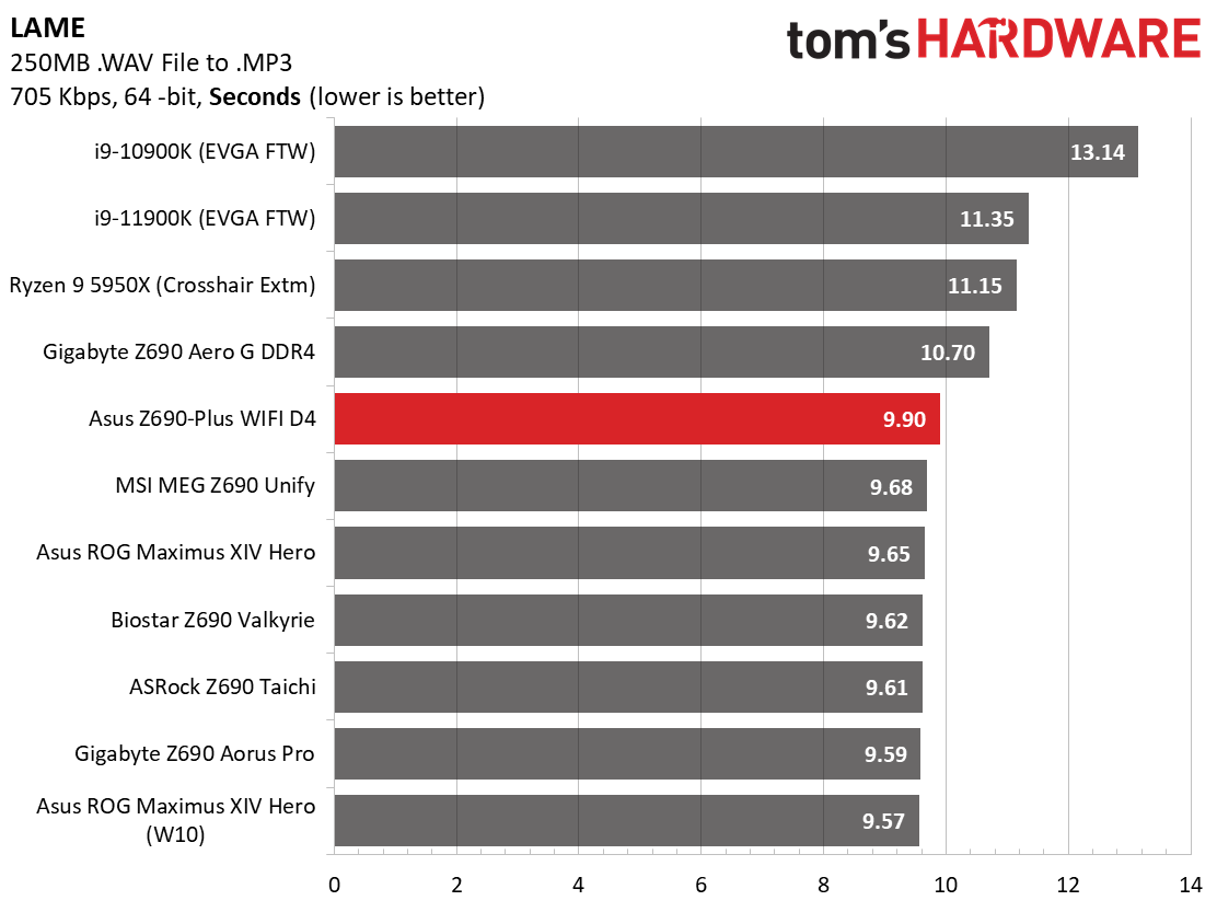 In the LAME test, the Z690-Plus WIFI D4 was slower than the other Alder Lake, finishing the benchmark in 9.90 seconds, just over 0.2 seconds slower than the MEG Z690 Unify that ran the test in 9.68 seconds. The Gigabyte Aero G DDR4 was slower in part due to it running Gear 2 on the memory.