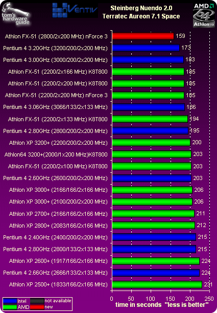 Here the professional program is working with a project file volume of over 2 GB. The Athlon FX-51 beats the normal Athlon 64 FX by 16.4 per cent.