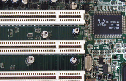 The ATI reference motherboard, built by one of the biggest motherboard makers in Taiwan, gives the impression of a standard retail motherboard. It comes equipped with a Gigabit Ethernet controller from Realtek, a Firewire chip, a sound system, a CNR slot (communications & network riser) and two Serial ATA ports that add to the dual-channel UltraATA/100 controller.