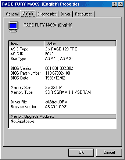 Clicking to the next tab, you'll find another unique feature to the Rage Fury MAXX. You are given the ability to low level test some of the basic components on your video card from video memory to testing the DAC. Not too shabby.