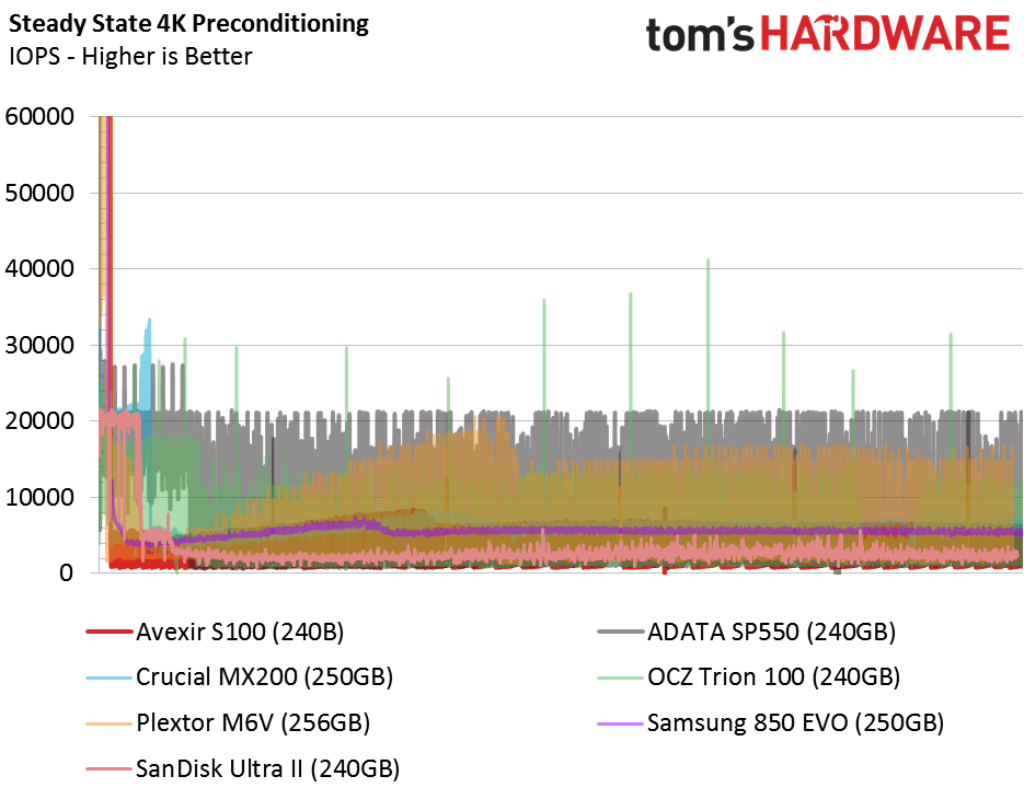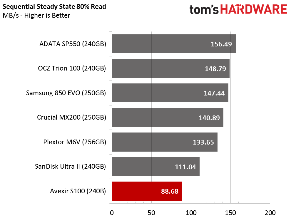 The S100's asynchronous MLC flash acts more like TLC when it is in steady state. The JMF670H controller is the likely source of the problem. In our sequential steady-state test, the performance hovers around 80 MB/s until we get to a 100 percent read environment. We wouldn't recommend running this SSD with a lot of data on the drive.