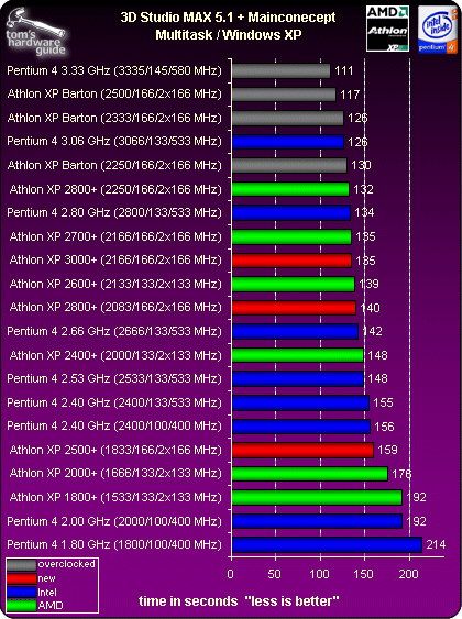 The multitasking benchmark clearly shows that Intel's HyperThreading technology is still a little rough around the edges. The overclocked CPUs take the lead, while the Athlon XP 3000+ has a disappointing showing. AMD should revisit its model-numbering system before it loses users' trust.