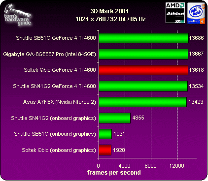 3D Mark 2001 measures the Direct3D performance of DirectX 8 in Windows XP. This test shows that the Soltek and Shuttle systems are about even. The onboard graphics are way behind the AGP graphics card in both machines.