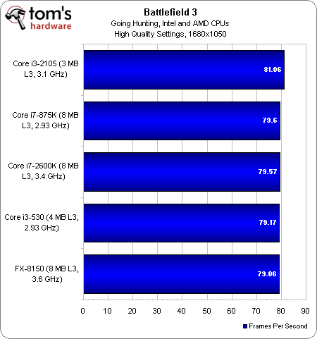 Looking back at my notes for the Bulldozer launch (AMD Bulldozer Review: FX-8150 Gets Tested), AMD was very enthusiastic about FX’s performance in Battlefield 3 (multiplayer beta, at the time). And no wonder—Battlefield 3's single-player campaign doesn’t care if you’re using a $130 Core i3 or $315 Core i7. It doesn’t care if you come armed with two Hyper-Threaded cores or four Bulldozer modules. It just. Doesn’t. Care.