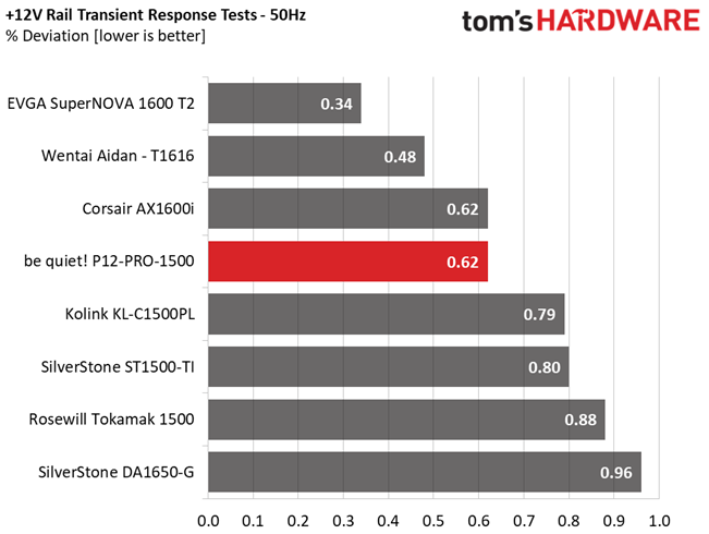 The transient response is good at 12V, but nothing can beat Super Flower's Leadex platform (used by the EVGA 1600 T2) in this area. Voltage deviations are low in the other rails, too.