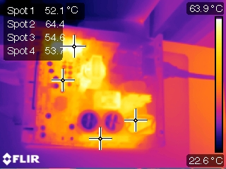 We applied half-load for 10 minutes with the PSU's top cover and cooling fan removed before taking photos with our modified FLIR E4 camera that delivers 320x240 IR resolution (76,800 pixels).